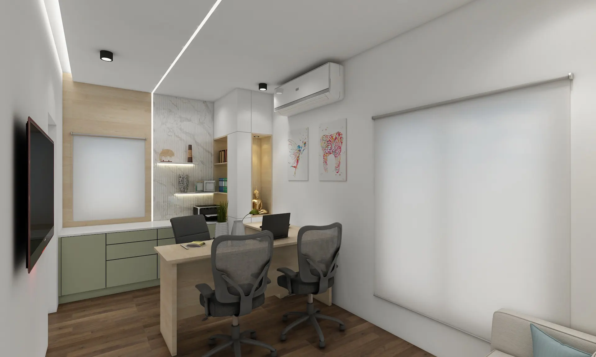 APSE Design, with over 15 years of experience, crafted the studio’s interiors to balance professional aesthetics with healing ambience. The design incorporates functional workflow with soothing visual elements, ensuring the space supports clinical excellence while making every patient feel at ease during their visit.
